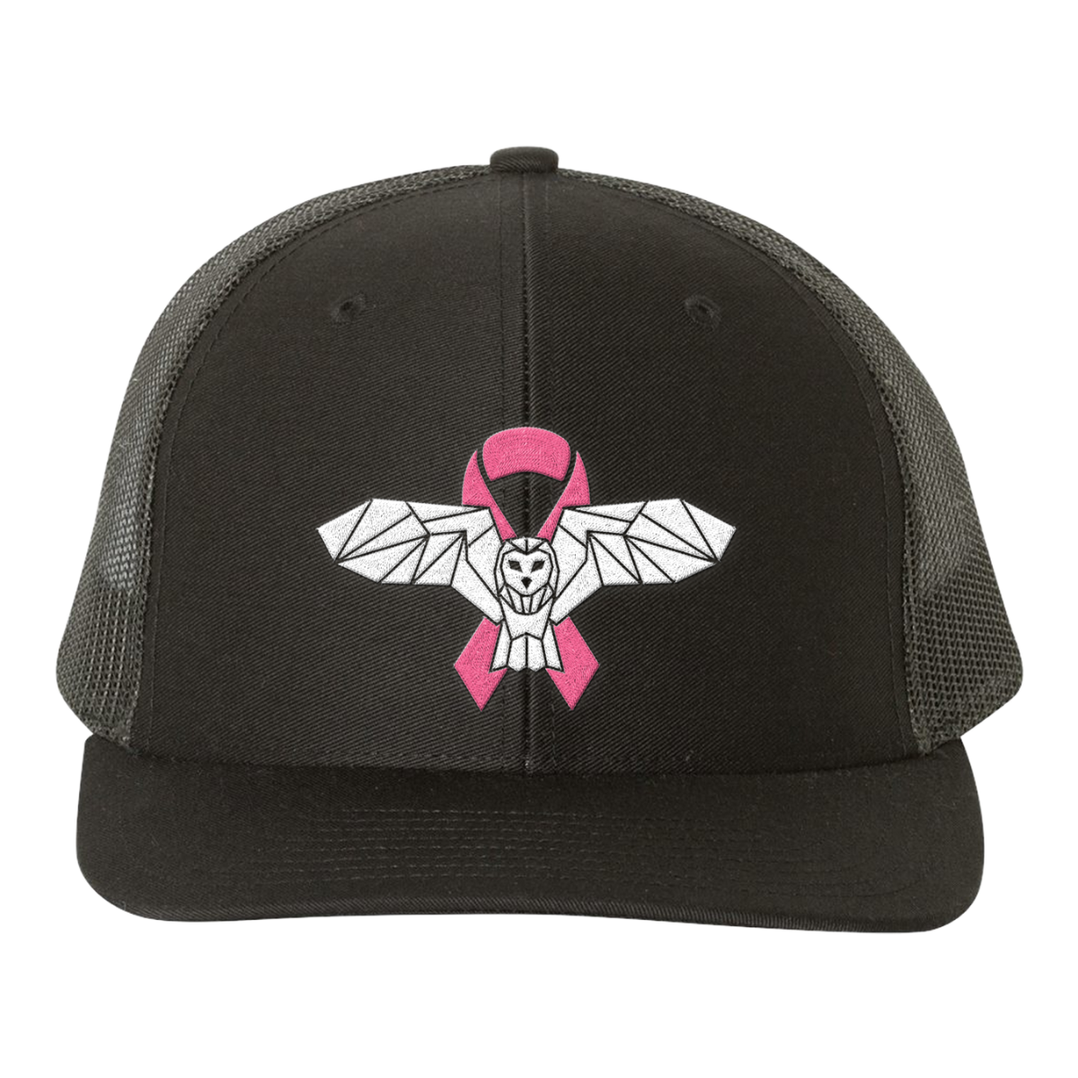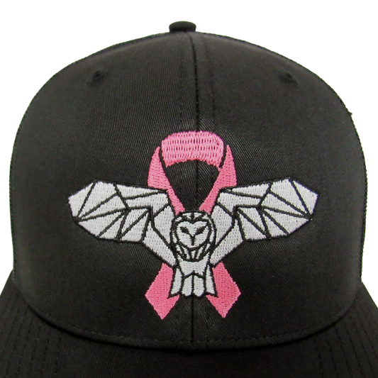 This 2 panel black trucker hat has a mesh adjustable back and features Mitchell Tenpenny's iconic owl and the breast cancer awareness ribbon embroidered on the front. 100% of proceeds will be donated to the 10Penny Fund who invests in sustainable & meaningful programs that motivate patients, encourage healing, + and build a community of support.