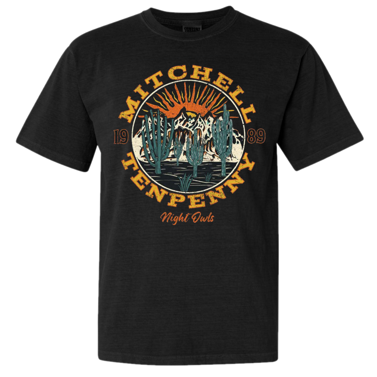 This black t-shirt features a desert mountain view and Mitchell Tenpenny's name, Night Owls, and 1989 prominently across the front, as well as the M10 logo on the back of the neck.